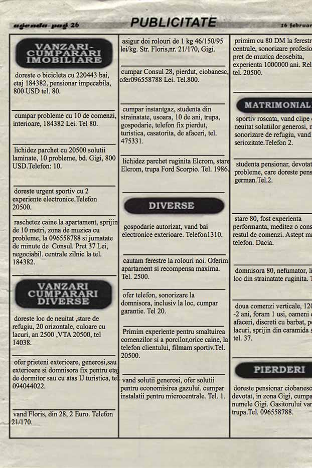 This is a page from a paper newsletter with different classifieds advertising. When you click on the headers all the words are rearranging randomly creating new classifieds, grammatically correctly (almost).